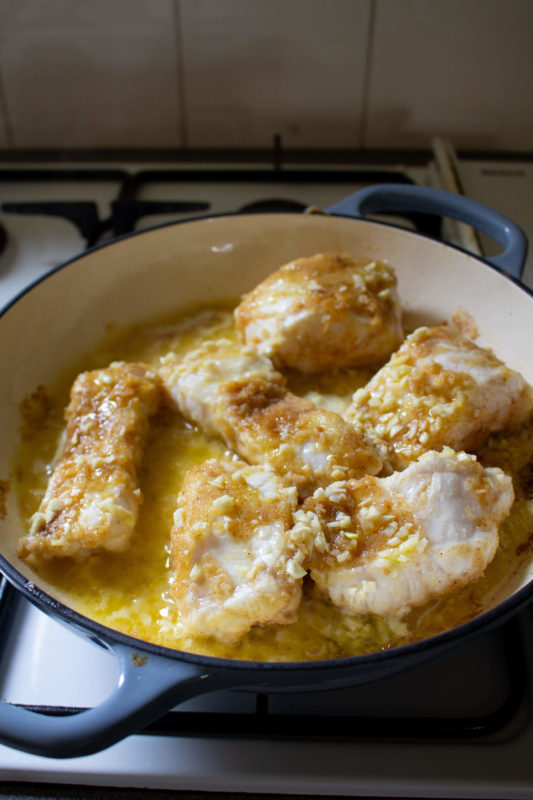 - Add the fish portions and sear one minute or less on each side – we aren’t cooking the fish in the pan, just giving it some colour. Remove from heat.