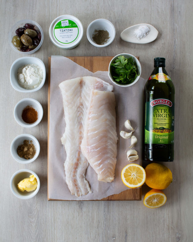 - Remove from the oven, drop olives in the gaps between fish pieces and sprinkle parsley all over. Serve with store bought (or homemade) Tzatziki, vegetables on the side, and some crusty bread. Enjoy!